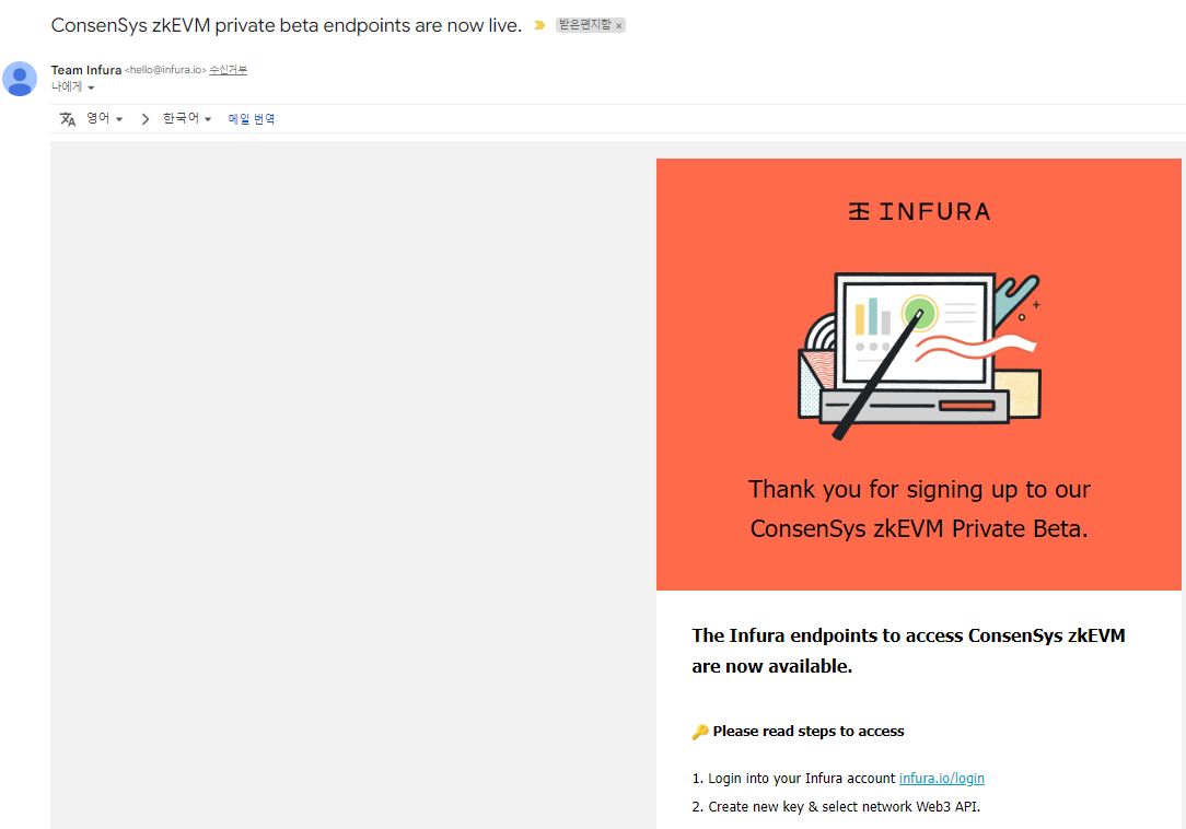베타 테스터를 신청하셨던 분들은 Team infura로부터 이렇게 이메일을 한 통 받으셨을텐데요.