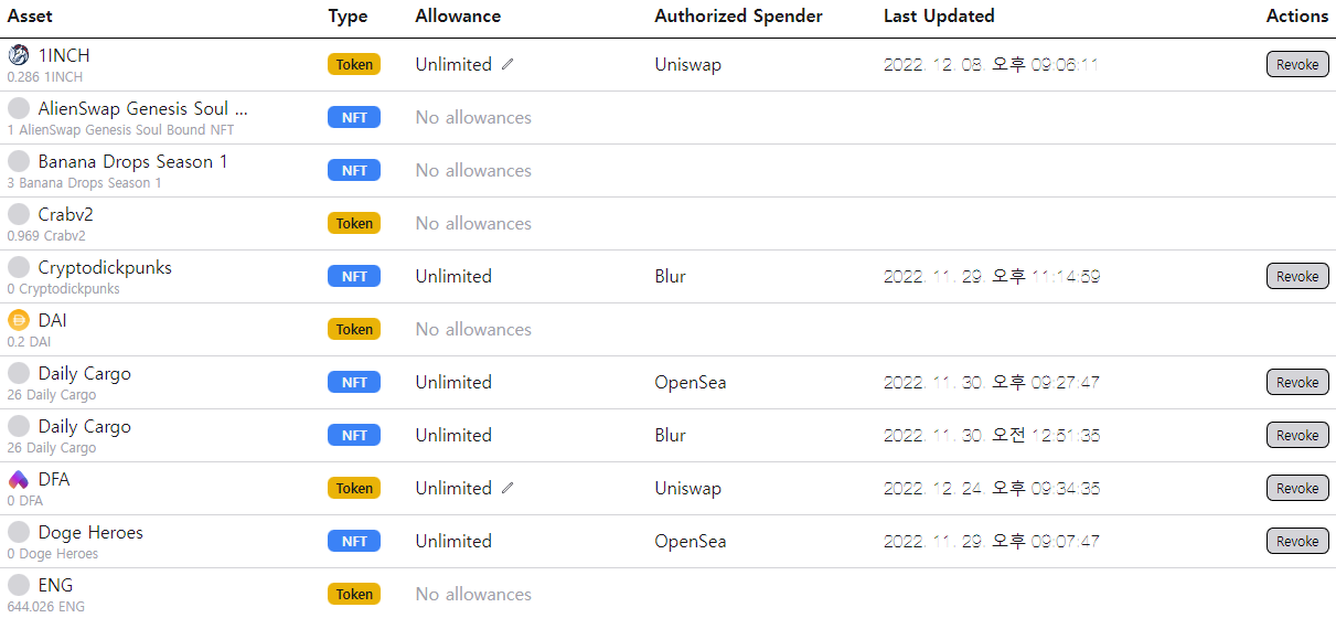 어떠한 디앱에 권한을 주었는지 모두 나옵니다